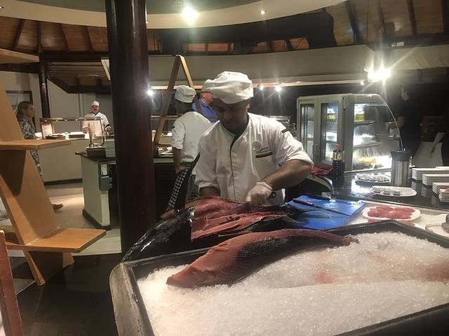 小黑帮我们推着行李带到机场外的一辆旅行车,他和司机就帮我们4个人把行李放好,全程没用我们动手,服务相当不错。机场到酒店就15分钟的行程,办理完checkin后我们去找点吃的,只有这顿是需要自己解决,酒店提供第二天的早餐和上岛以后的餐都是一价全包了。回酒店洗漱休息,准备明天登岛。