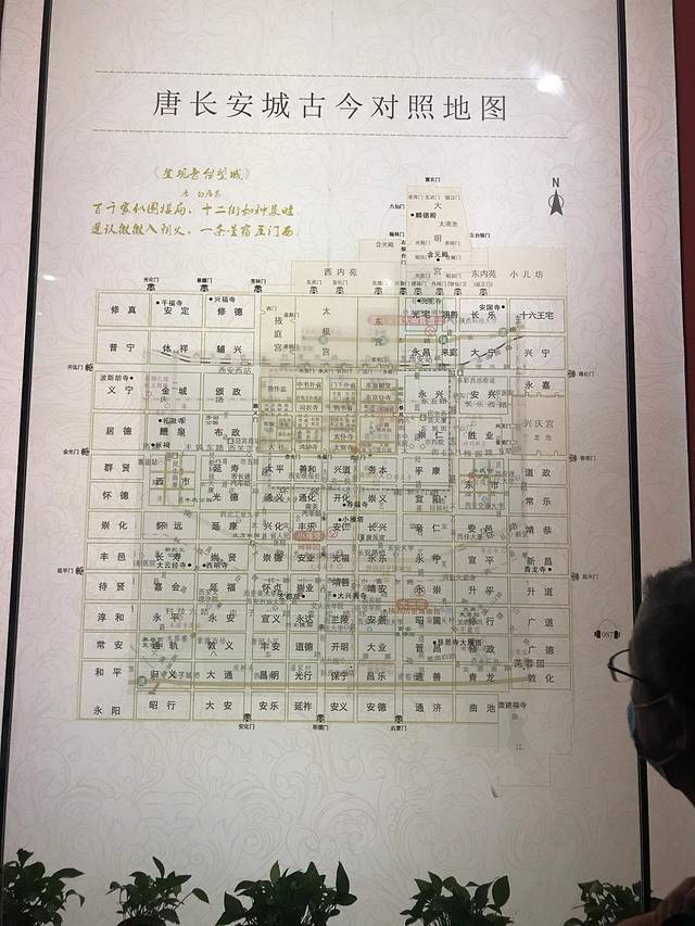 唐展馆里有一个古今对照地图,前面写的是唐长安各坊的名称,而后面是现在西安的地名。