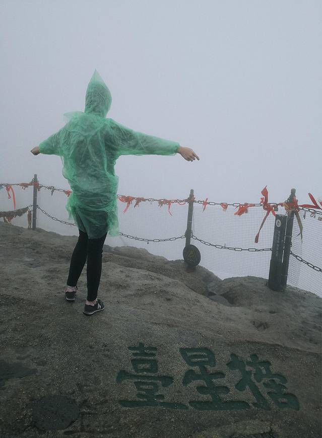 山上风真的超级大,雨衣被风吹的作响;并且和山脚有大概10度的温差,相当的冷;而且,因为下雨目之所急都是大雾,什么景色都看不到。