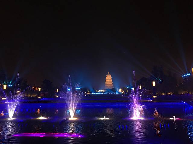 首先,这个位置正对着大雁塔,整个景极佳;其次,可以完整的观看喷泉舞动的样子,可以说是最佳的观赏位置。