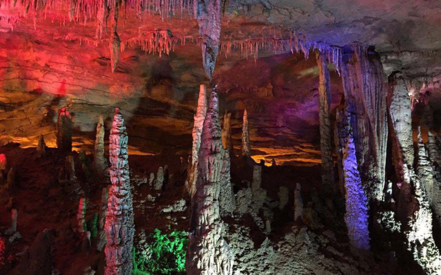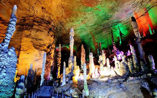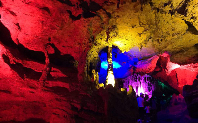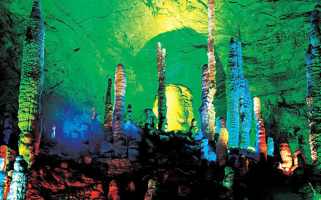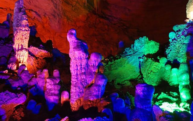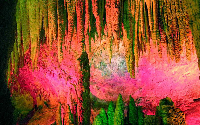 便看到了所谓的“龙宫”,那高高在上的最大的石笋即是龙王宝座。围绕宝座,无数根石柱、石笋似人似物,栩栩如生,仿佛在举行盛大的朝拜仪式。而倒垂的钟乳石,挺立的石柱,石珊瑚,在五彩灯光的照射下,异彩纷呈,令人眼花缭乱,目醉神迷。