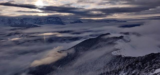到达山顶等日出,脚都冷麻了,虽然没有牛背山的日出震撼,但是在日出接近尾声时,一束光穿破云层,把山谷与天空间漂浮着的一片又一片云彩点燃、照得通透,我就像青蛙躺在池塘底的水草上,看阳光穿透水面,大自然的手笔,太让人震撼了。