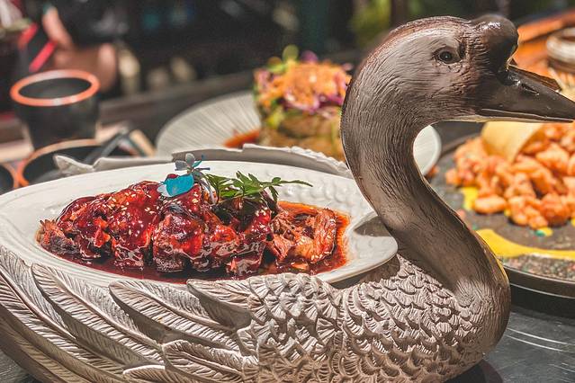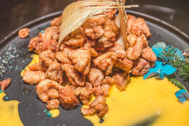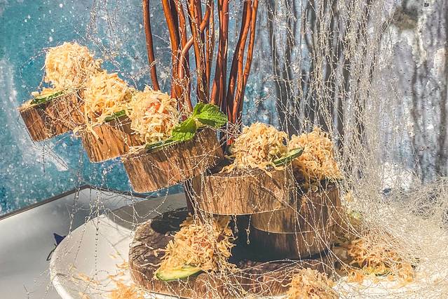裹着牛油果和芥末的虾球就放在木台阶上,真的有种《绿野仙踪》的感觉,这外层口感香甜酥脆,虾球更是Q弹,还有股淡淡的芥末味.