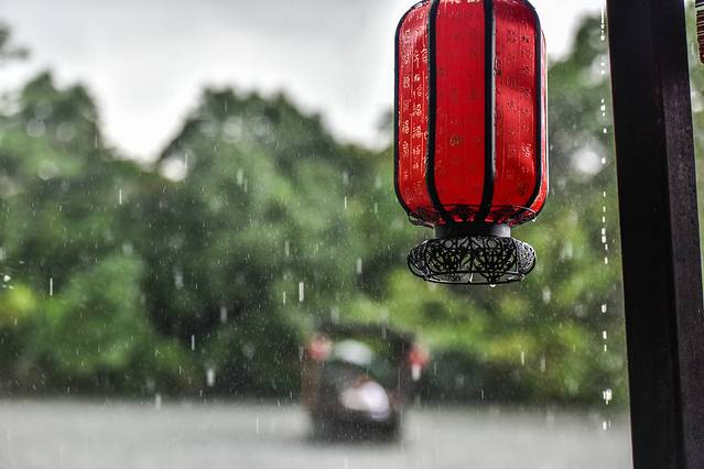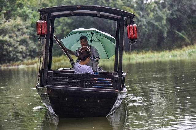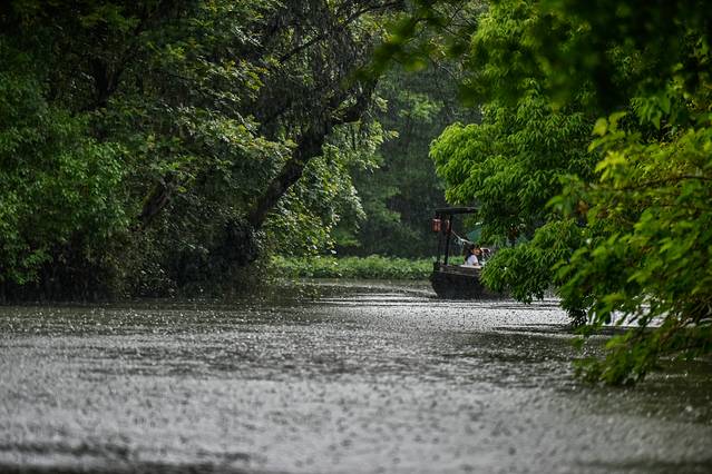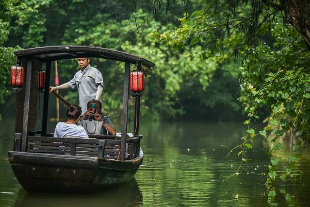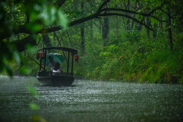 本来是一个安静的橹船行驶在水面上,一场突如其来的暴雨打破了这里的宁静,却多了几分诗意的情怀。无论是坐在船上的我们欣赏对面橹船上的人还是对面橹船上的人看我们,本身就是一种意境禅了。大雨中的橹船在这水面上传达了烟雨江南本有的气息,你们喜欢吗?