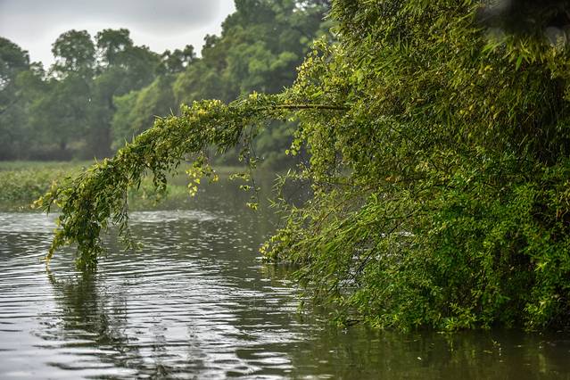渐渐地这大雨转为小雨了,湿地上的这些植物都被大雨压弯了腰,雨水形成的水珠在植物的叶子上清晰可见。这种画面也是一种诗情画意般的景象,真的是怎一个“美”字了得?