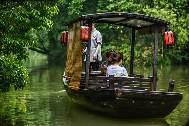 作为杭州唯一拥有码头的酒店,还有属于自己的橹船。想不想来这里打卡、游览观光以及吃下午茶呢?这种特有的体验项目非常不错,我个人而言非常喜欢。