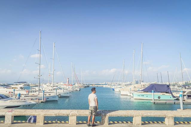 这里的潮见桥周边的车水马龙,路过的行人悠闲地漫步在桥边上,没有夜晚桥边的嘈杂,看着远处的帆船,在林立高耸的楼房的背景下,过尽千帆,有一种怡然自得的惬意。