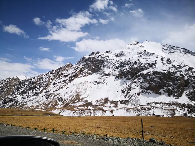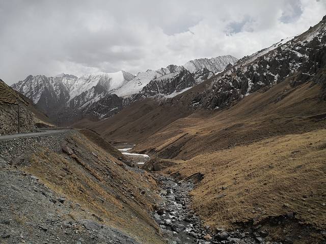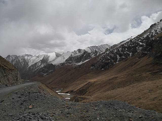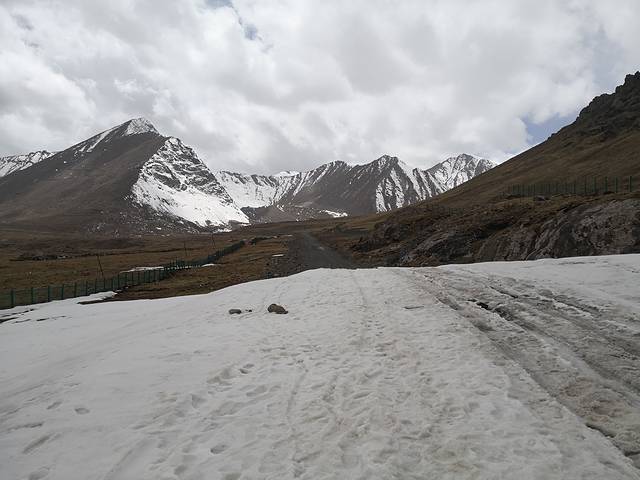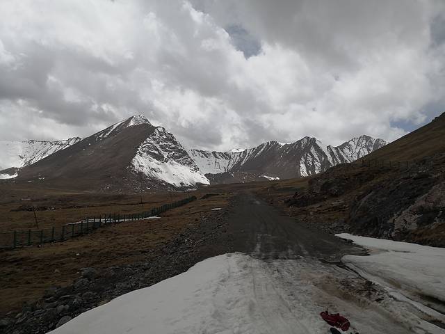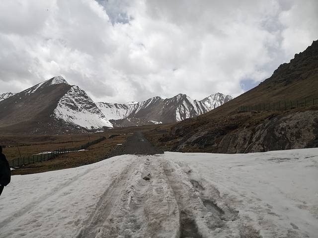 这是我车现在冰川的地方,这个地方好像是属于雪崩留下来的雪堵在的路上。