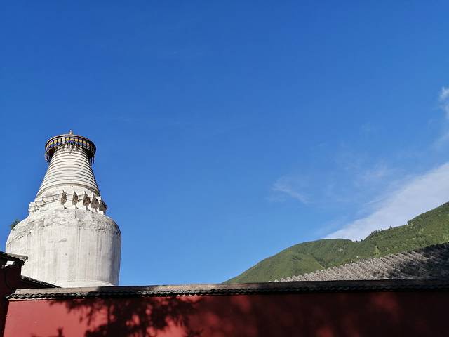 寺中的大白塔,全称为“释迦牟尼舍利塔”,是寺内的主要标志,也是五台山的标志性建筑,红墙、琉璃瓦殿顶的陪衬下,显得尤为壮观。塔基座正方形,藏式,总高约60米,全部用米浆拦和石灰砌筑而成,在青山绿丛之中,高耸的白塔格外醒目。