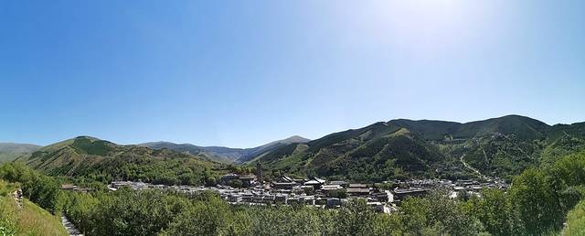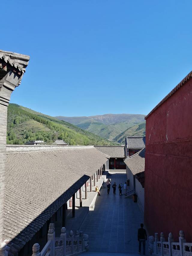 菩萨顶盘踞山头,地势较高,从菩萨顶往下俯瞰,可以远眺五爷庙、显通寺和塔院寺等五台山著名寺院。