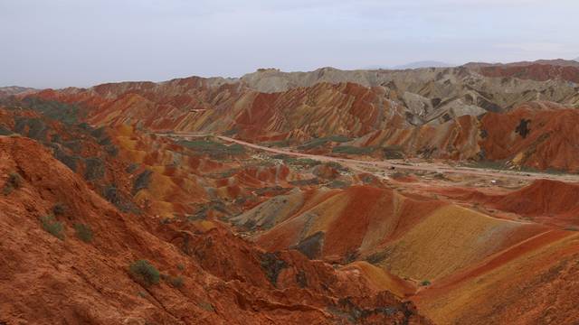 张掖的七彩丹霞,整个景区很大,进去以后是坐公交车的,在每个观光点都可以下车游玩。不过“天弃之子”们依旧没有遇到好天气,依旧是乌云沉沉的一天,丹霞在大多时候都没有宣传图里那么美丽(忘了是哪位小伙伴说的,像五花肉,无意冒犯但真的有点像)。尽管如此,在乌云散开阳关短暂出来的那几分钟里,我们还是幸运地感受到了七彩丹霞的壮观。