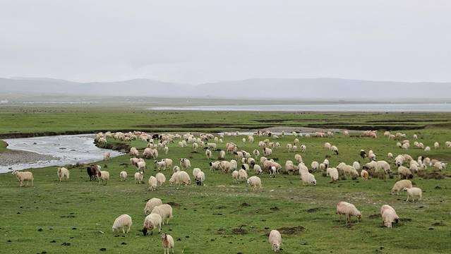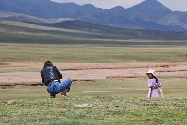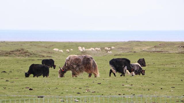 从拉脊山下来后我们便直奔青海湖,临近青海湖时,道路两边有大片草原,放牧着牛羊,让人真切地体验到“天苍苍,野茫茫”的感觉。