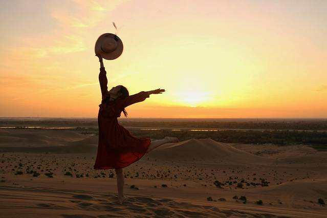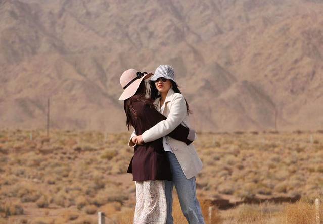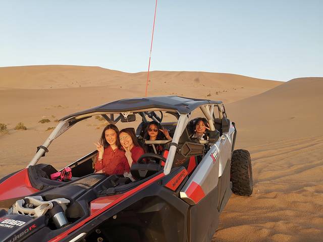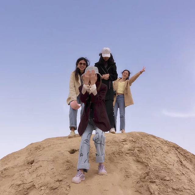 下午去了我们心心念念的沙漠,可以说是这次旅行中运动量最大的一段行程了,也解锁了好多第一次体验:第一次爬沙坡(真的很费体力,摄影师体力急剧下降中),第一次见到骆驼(大家都嫌臭,没上去坐),第一次坐沙漠越野车(200元一次,真的很值,太刺激了,还能看到日落;就是中途车速太快,我一度怀疑要翻车),第一次参加篝火晚会(不知道在嗨什么但是跟着一起嗨就行了),第一次在沙漠里拍星空(虽然只拍出了黑乎乎的一片,没有三脚架真的伤不起)