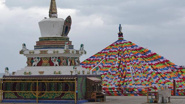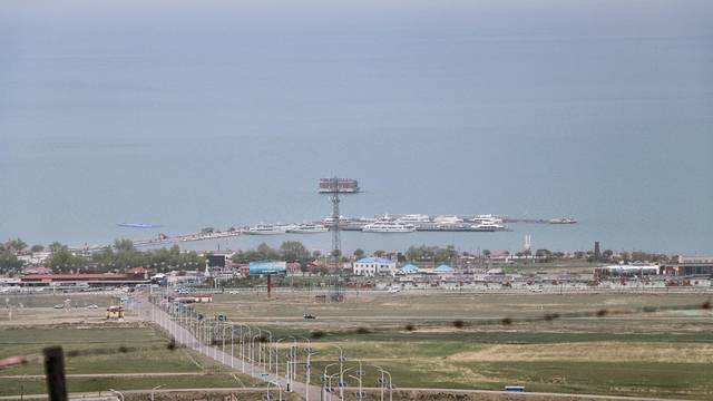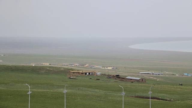 远眺青海湖边上的农舍,雾蒙蒙的草原与湖泊另有一番韵味。
