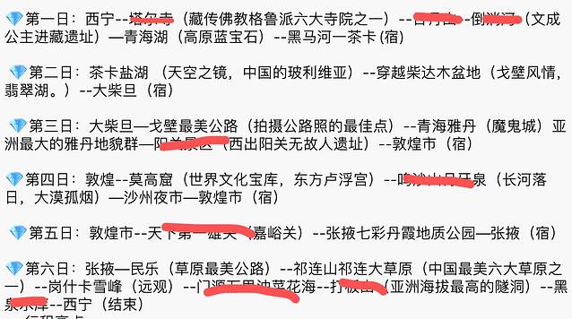 司机小哥哥提供的路线图,图中标红的景点是我们没有去的,这一部分是由于疫情导致部分景区没有开放(比如塔尔寺),或是季节性景色(门源油菜花七月中旬才开放)还没有到观赏时间,当然最主要还是天气太热、体力太差(比如阳关景区、嘉峪关、月牙泉等)。