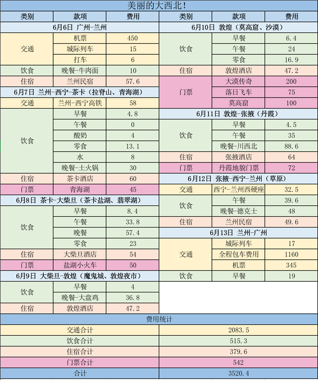 如图所示,本次行程的花费主要集中在交通上,包括往返机票、兰州-西宁往返动车票以及全程的包车费用。其次是门票费用,主要是沙漠里的游玩项目比较费钱(但是体验很不错,还是值得的)。住宿和饮食方面,均摊到五个人,花费比较低一些。