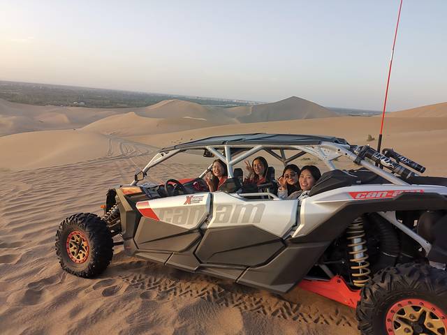 这一天的主要行程就是莫高窟和沙漠。莫高窟里面不让拍照,我们只在外面简单拍了一些图片留念。去哪个窟好像是随机的,会有导游带进去,并且进行讲解。还是感觉非常神奇的,以前只在语文课本里看到的内容,如今真正身临其境了,能感受到那种历史的沧桑和厚重感。不过我对窟的内容确实没啥印象了,只记得那里风沙特别大,眼睛又干又疼,几乎不能视物。