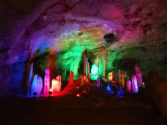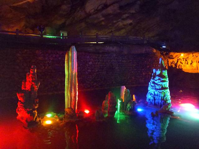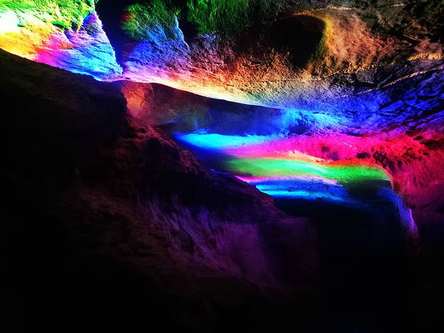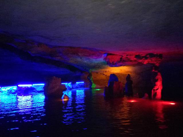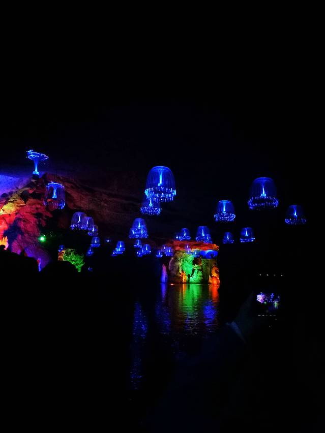 进入景区后就是暗河荡舟的排队通道 ,节假日人比较多需要排队。这条暗河长约千米,10人一条小船,由工作人员撑船进入溶洞。溶洞里冬暖夏凉,常年18度,非常凉快。一路上工作人员一边划船,一边讲解钟乳石的形态和历史。游船过半后,有一个地方可以下船步行观赏洞内的奇观,船会在另一头等着。