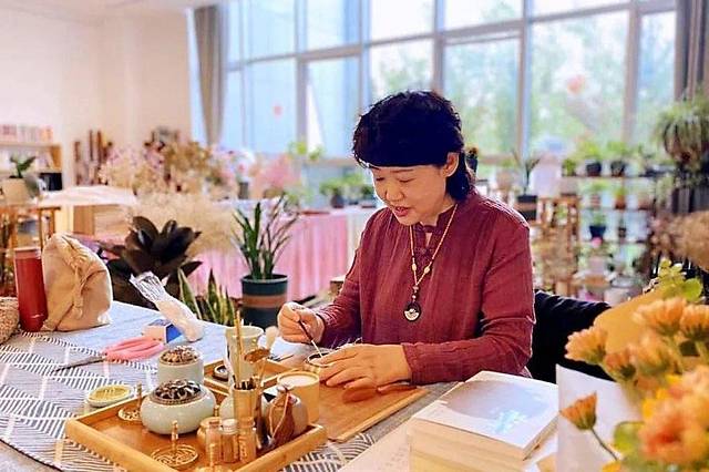 偶遇王女士做客香道馆,讲授香道文化、现场传授打香篆的技巧。
