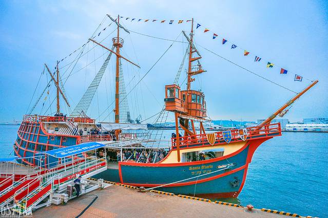 而游览大阪湾很好的一种方式便是乘船,在大阪有许多种船可以船游大阪湾,而我们选择的是圣玛利亚号帆船。它是以哥伦布发现新大陆时的海船“圣玛利亚号”为原型,放大两倍制造而成的游船。