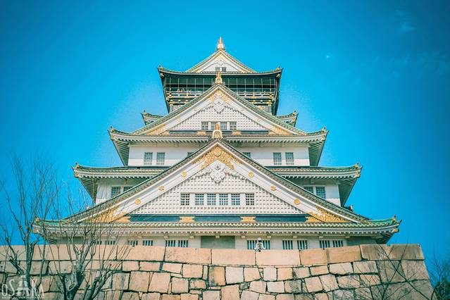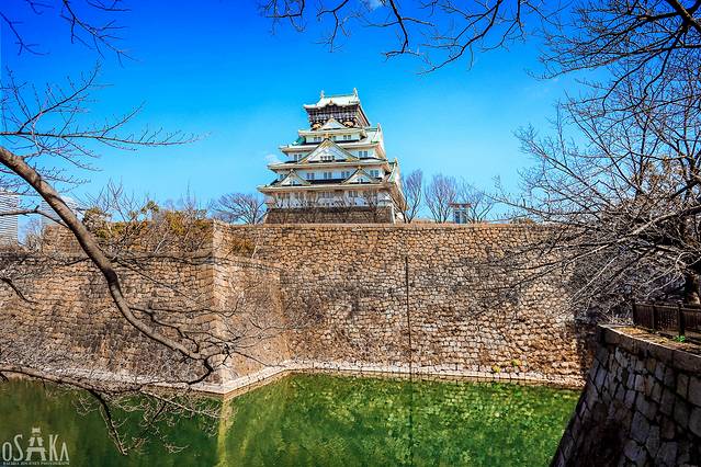 雄伟的护城河有七十至九十米,大量巨石堆砌的石垣有二十米高,据说石头达到了一百万块,足以表现了大坂城的固若金汤。
