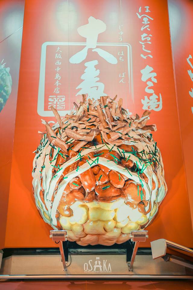 道顿堀是章鱼烧一级战区,这里有十几家章鱼烧店,而十八番依旧很受欢迎,我们排队排了许久才买上。500円一份,有六颗。