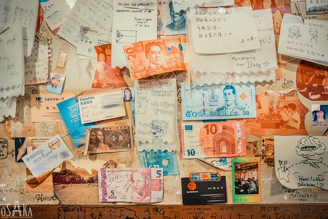 我们是在参观完顶层的空中庭园之后,刚好中午时间在这边吃的。这家店很小,只能招待十几位顾客,建议一开门就去,不然就得等位许久了。店内的墙壁上贴了很多东西,钱、照片、名片、留言、图画,什么都有,都是顾客留下的。