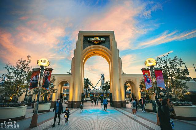 日暮降临,霞光映照下的环球影城,色彩缤纷。最后在园区的门口,会有卡通玩偶欢送大家出园,可以找自己喜欢的合影哦。