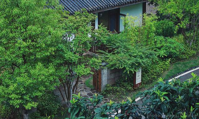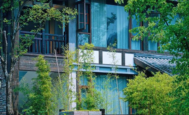 围绕着酒店,小院子,也都被绿树环绕,绿竹鲜花拥簇,白天清风和煦,夜晚星月明照,凭栏临风或床头小憩,郁郁青山与悠悠碧水尽收眼底。