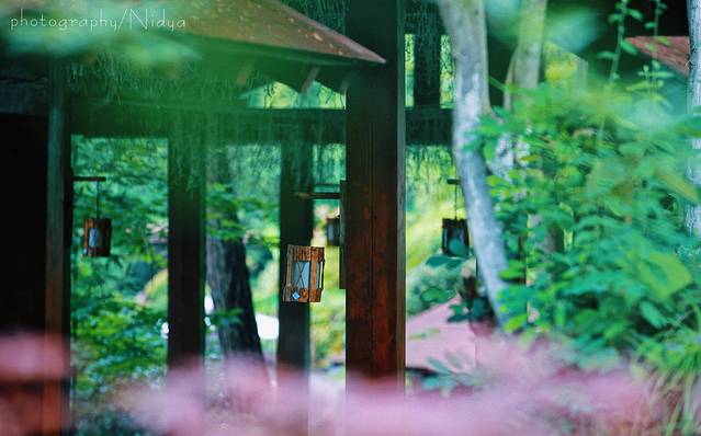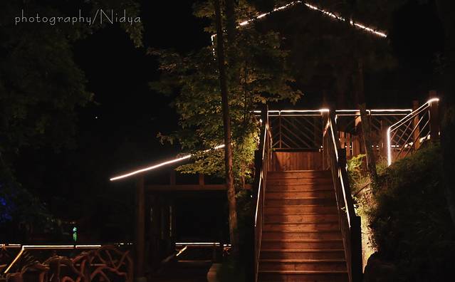 进入夜幕下的山野温泉,光源就是来自路边暖黄色的小灯,向山里望去,星星点点,似是误入了银河。因为傍晚才下过一场雨,夏夜的风变得不再黏腻,带着还未褪去的凉意扑面而来。