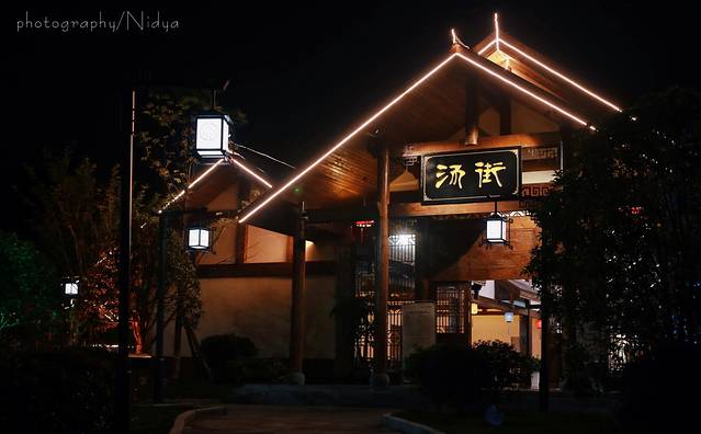 穿过大厅和走廊,就踏上了一条水泥小道,暖黄色的路灯映照在漂流的水道上,变成粼粼波光,延伸到夜场温泉的入口——汤街。