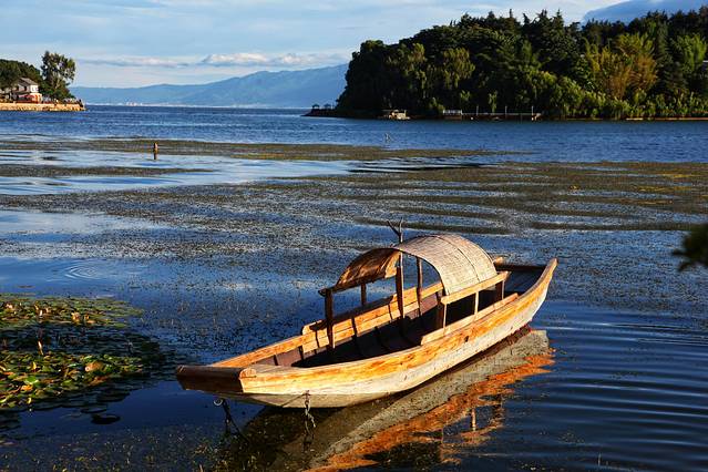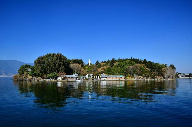 风情岛在玉几岛对面,要做船前往,大概五分钟就能到了,岛很小,有汉白玉观音和南诏行宫两个景点。岛上有卖各种小吃,下午茶,还有一片小沙滩,很多新人在这里拍婚纱照。