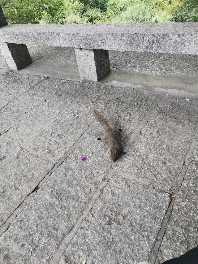 我们下来了之后在旁边的亭子里吃带来的鲜花饼和小面包当作午饭,周围有好多小松鼠(毕竟山里到处是松果),有一只特别不怕人,赶都赶不走,而且巨挑食只吃鲜花饼,根本不care小面包。