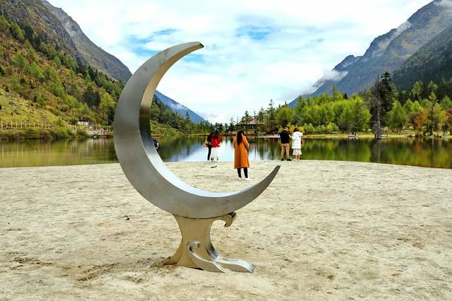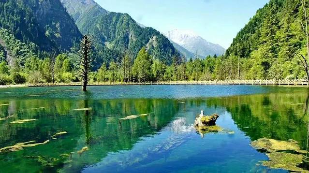 磐羊湖是毕棚沟景区的经典打卡点之一,一汪清澈的湖泊被雪山和灌木环抱,春夏赏绿,秋赏彩林,冬赏冰雪,一年四季,美景不间断。