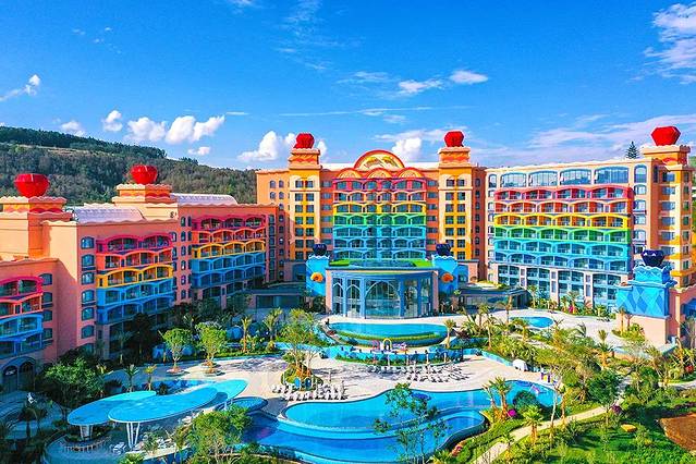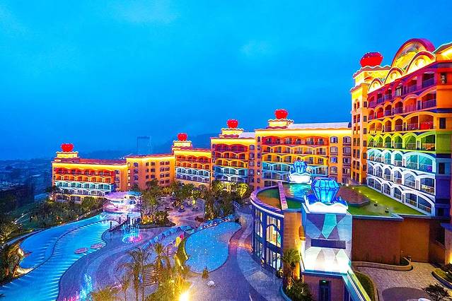 走进酒店,会看到珊瑚、海螺、鲸鲨、海豚、水母等丰富的海洋元素,让你享受震撼的视觉效果。海豚湾注重居住的趣味性、舒适性与温馨感,来到这里,让你居住每一天都不平凡,可以享受到新颖有趣而又不失温馨的度假居住感受。海豚湾主题酒店,设有七百多间客房,全部以海洋为主题,完整讲述了海底奇乐小队的魔幻历险记。在海豚湾酒店,还住着杰登队长、鲨克飞侠、奥特佩斯女王、波波妮、悠妮主五个小冒险家,你想和他们开启惊险旅程吗?酒店的服务非常贴心,走在酒店里每位工作人员都会热情地问候,还会有表演的小丑哥哥与你嬉戏。房间里。酒店会为你准备精致的水果甜点,还会有可爱的纪念小礼品,我真的觉得超级暖心。酒店设计有不同主题的亲子客房,比如海豚、白鲸、鲨鱼和水母等充满海洋气息的主题,并提供全套主题定制客房用品,大床房都会配一个小小的儿童床,双床房没有。卡通的亲子客房设计细节很到位,房间没有尖锐的直角。浴室里配备了儿童的洗浴用品,大部分房间都有阳台。这里的卫生间,铺满了渐变蓝色的方格瓷砖,同样是海洋的气息。