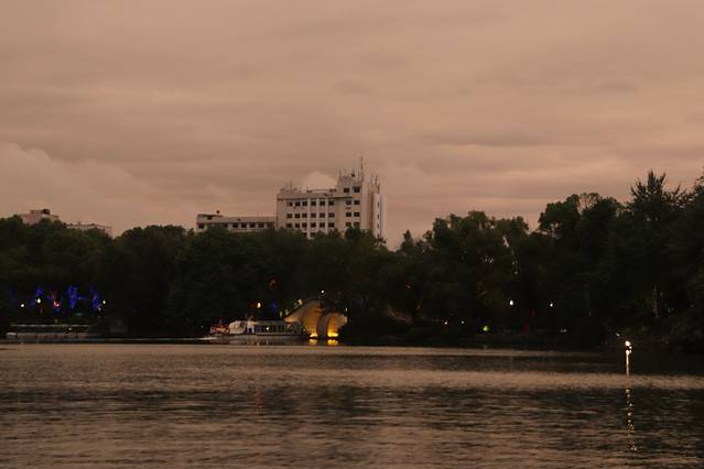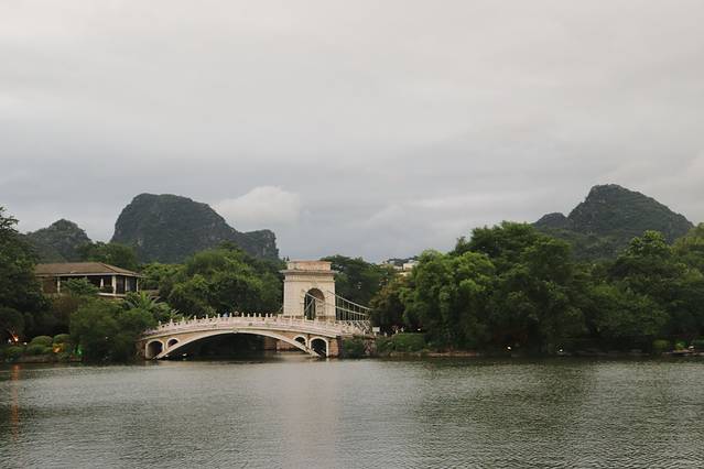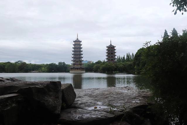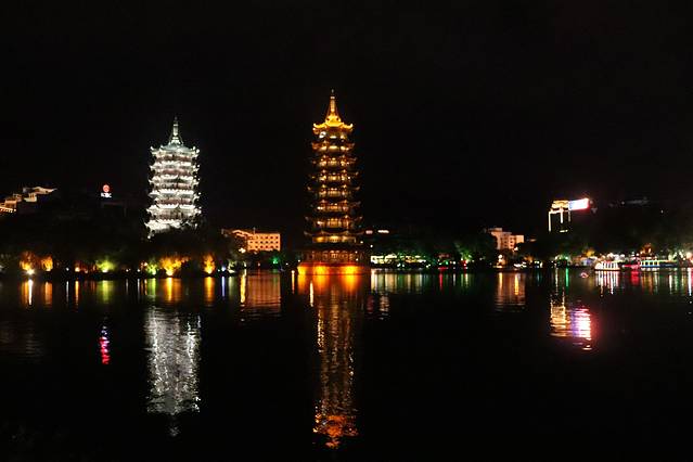 从桂林西站公交来到住处(日月双塔附近),时间在18:00左右,从日月双塔开始,徒步杉湖和榕湖。景区是完全开放的,如果你闲徒步耗时费事也可选择游船,一个小时左右便能游玩两江四湖全部景点。象山公园里日月双塔不远,公园外面就可以看到象山,近距离那自然是需要门票的,这可以根据自己的喜好选择。