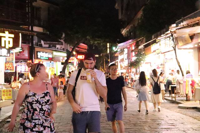 阳朔码头到西街2公里左右,可以选择打车也可以步行。我和游轮上认识的小哥约好晚上同游西街,品尝西街美食。对于吃的我一向不是很在意,快进夜了,我和小哥逛了一圈,最终选择了阳朔的啤酒鱼作晚餐。