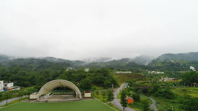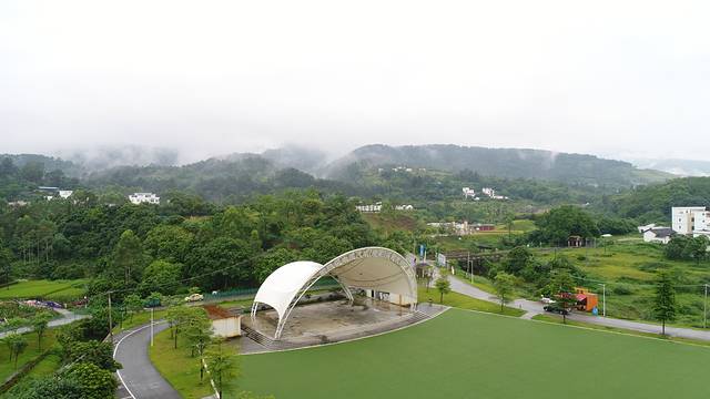 下车映入眼帘的就是一片翠绿,依山而建。也许是要下过雨,山上仙雾缠绕,趁这般美景,无人机先拍下来。