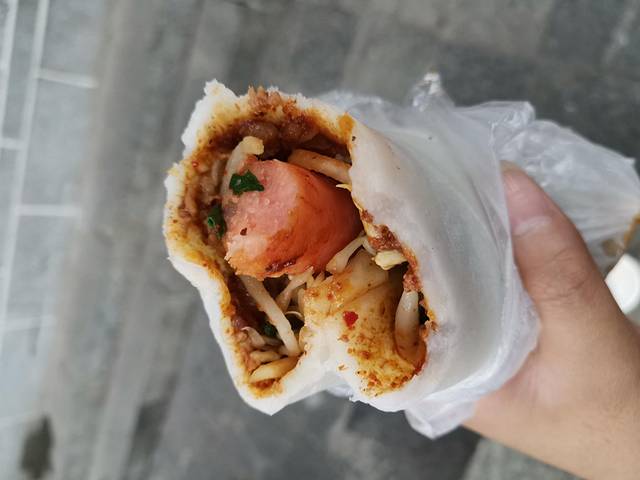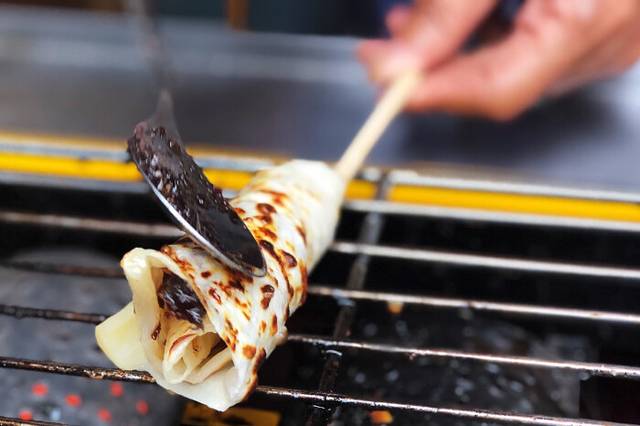 手揉饵块由大米揉制而成,口感比较柔软、厚实,带有清新的米香味,用手揉成片,在炭火上烤熟,加上特制的酱料,放上泡菜、土豆丝、韭菜豆芽等馅料,包上火腿肠或油条,再撒上花生末,那味道真是绝了!