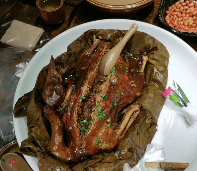 这是使用莲藕塘里生长的青青莲叶,包裹鸭子,制成的菜肴。清香可口,是一道“肉质酥”、“味清香”、“炸蒸型”的菜。