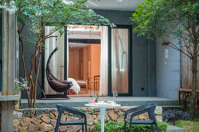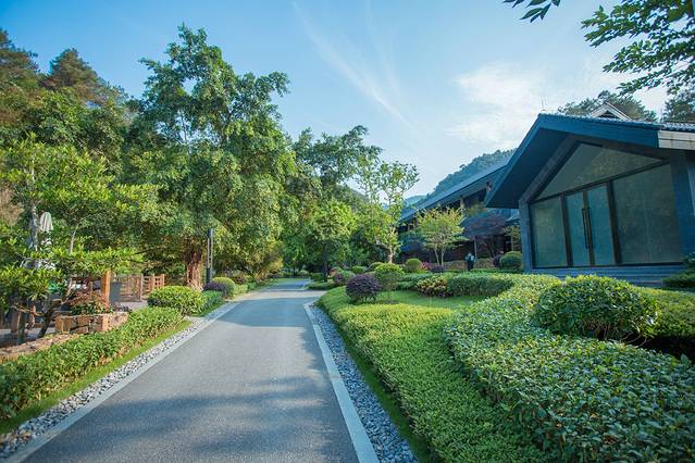 特别喜欢客房的这种设计,推开门就能看见庭院外面的景色,满眼都是绿色,治愈眼睛,更加治愈心灵。清晨推开门,能够听到鸟儿清脆的叫声,也能够看到山林间雨雾缠绕的美景,把休闲表现的淋漓尽致!