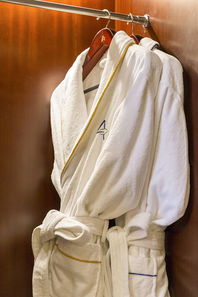 每个房间都有配套的睡衣睡服,一个大大的衣柜可以放置自己带的衣物,不会占用外在空间,干净整洁。有一个洗衣袋,可以把换洗的衣服放里面,交给服务员,送到他们的洗衣房给洗一洗,服务很周到。衣柜底部的位置有一个保险柜,挺好,贵重的物品可以放在里面(貌似我没有什么贵重的东西,也就不用了)。