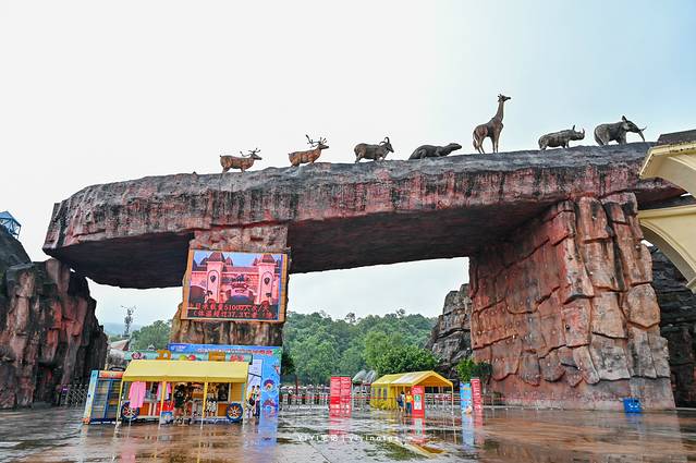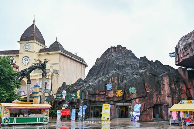 检票通过后,最先映入眼帘的就是这座火山了,火山旁的石块上,就是各种野生动物的雕像,非常形象生动,小朋友特别喜欢,这也算是乐和 乐都 主题乐园里的一大标志性建筑物了。
