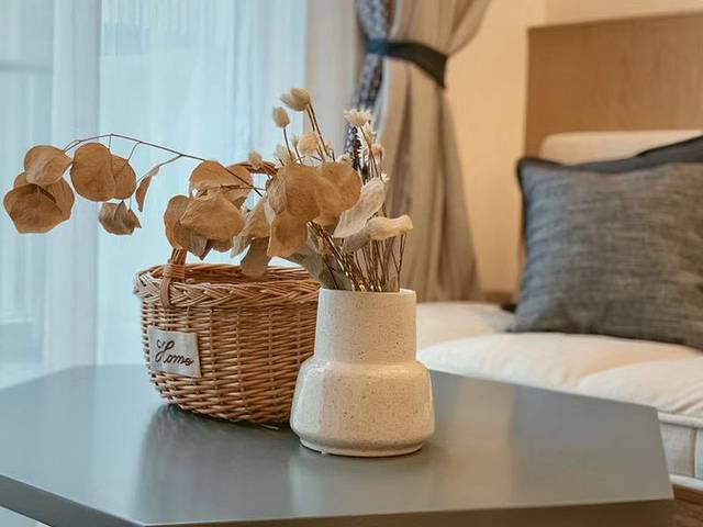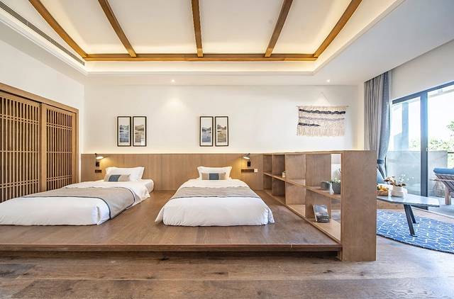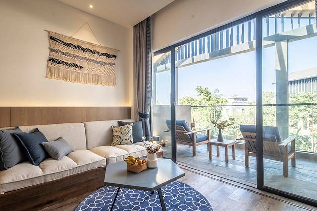 但个性化民宿的质朴外表下,软硬件配套都是星级酒店级别的标准。床品是浪漫又柔和的触感,拉开素色窗帘,阳光早已逃过落地窗溢满整个房间,构筑起温暖的情绪。