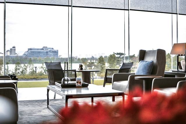 整个大堂开阔,左右依次分布着入住前台、大堂休闲室、生活空间、茶艺空间,林立而置,大堂落尽又是一个开阔的空间——落地式、大开放的大堂吧。