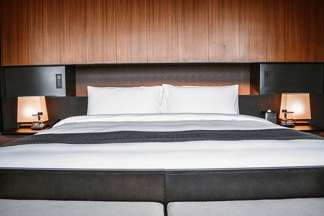整个房间最中间是一张大高床,品牌床垫、亲肤舒适的床品,柔软度刚好,让人扑上去,舒服地想马上入睡过去。直面江景的舒适大高床,不出房间,都可以舒适地躺上一天。