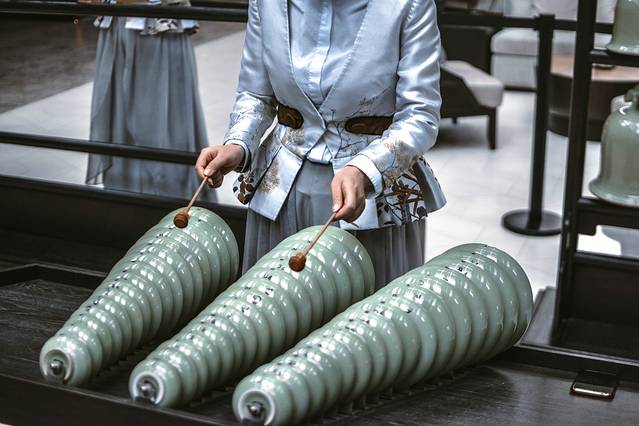 大门进来,拾阶而上,欢迎你的是大堂中央的诞生于六朝之时的青瓷瓯乐,中华民族非物质文化遗产。