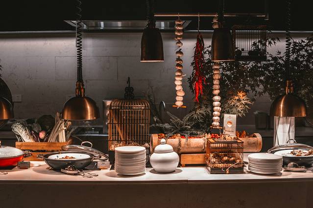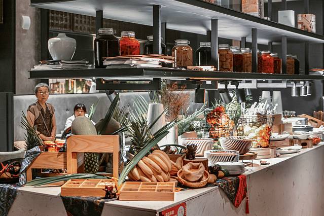 水沙涟斜对面的便是全日餐厅Ho Jia 9。“Ho Jia”一词来自于台湾话中“好吃”意思,它以自助餐厅的形式,网罗全球美馔,引入台式美食新理念,精心打造多款招牌料理创新吃 法,以 9 个开放式互动档口,为金陵食客奉上全新的味蕾惊艳之旅。