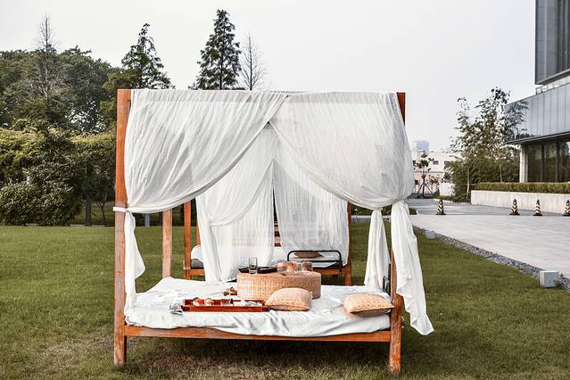 黄昏日落时分,可以在白纱缦的床座,绿草如茵,阳光摇曳,在这样美好的环境氛围里,享受一次甜甜的下午茶。