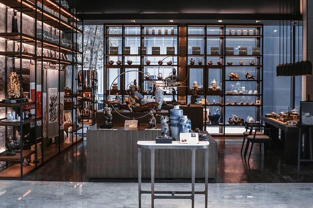 酒店大堂里,左右两侧各有一家店,分别为酒店的生活空间和文化空间。生活空间就很适合女孩子逛逛买买,不出酒店就可以享受逛商店的乐趣。文化空间,住宿客人可以提前预约茶艺和沉香体验。